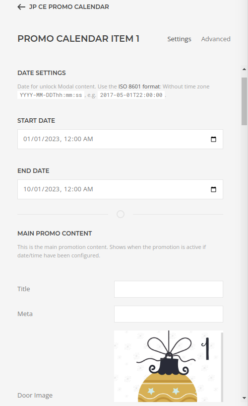 With the JP CE Promo Calendar you can easily create a promotion event calendar. Perfect for example as a Christmas Holdiday Calendar or for any kind of events. Maybe Black Friday or similar events. Or just have something fun on your website.